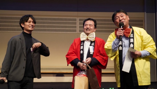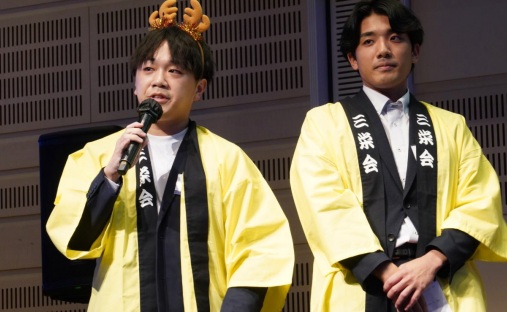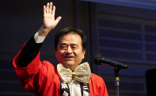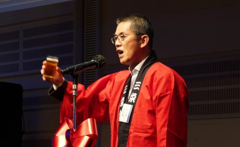 冒頭、菊地原会長から開会のお言葉、その後三井物産の渡辺人事総務第一部長から乾杯のご発声をいただきました。この日はお二人だけでなく、ご参加いただいた東京三栄会幹事の皆さま全員が恒例の法被と派手な蝶ネクタイでドレスアップされていました。